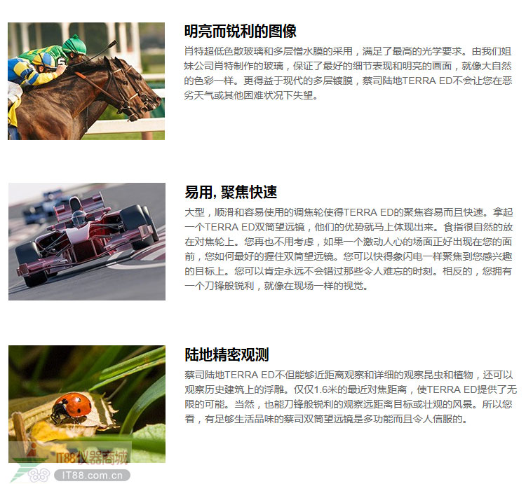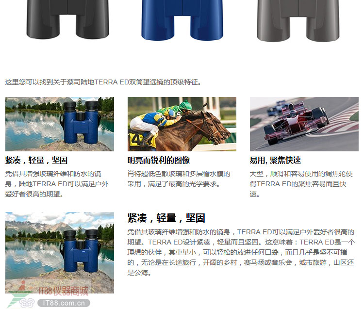 新的蔡司陸地terra ed 8*42和10*42是您近距離體驗生命里最迷人時刻的理想伙伴,無論何時何地。其功能迷人,設計現代,而且有著690克輕巧的重量,得益于其纖細的外型,使得望遠鏡緊湊而且堅固。肖特超低色散玻璃和憎水膜的使用,保證了最微小細節的優異體現。事實上,terra ed的防水和充氮進一步強調了其戶外的目的。terra ed有著一個易于使用而且快速的對焦機構,并且最近對焦距離僅僅1.6米。terra ed可以隨時帶上就走,無論是激動人心的體育比賽,重大場合或音樂會,迷人的旅行,登山或海濱散步。蔡司terra ed是有著生活品味的雙筒望遠鏡,在任何地形都值得信任。