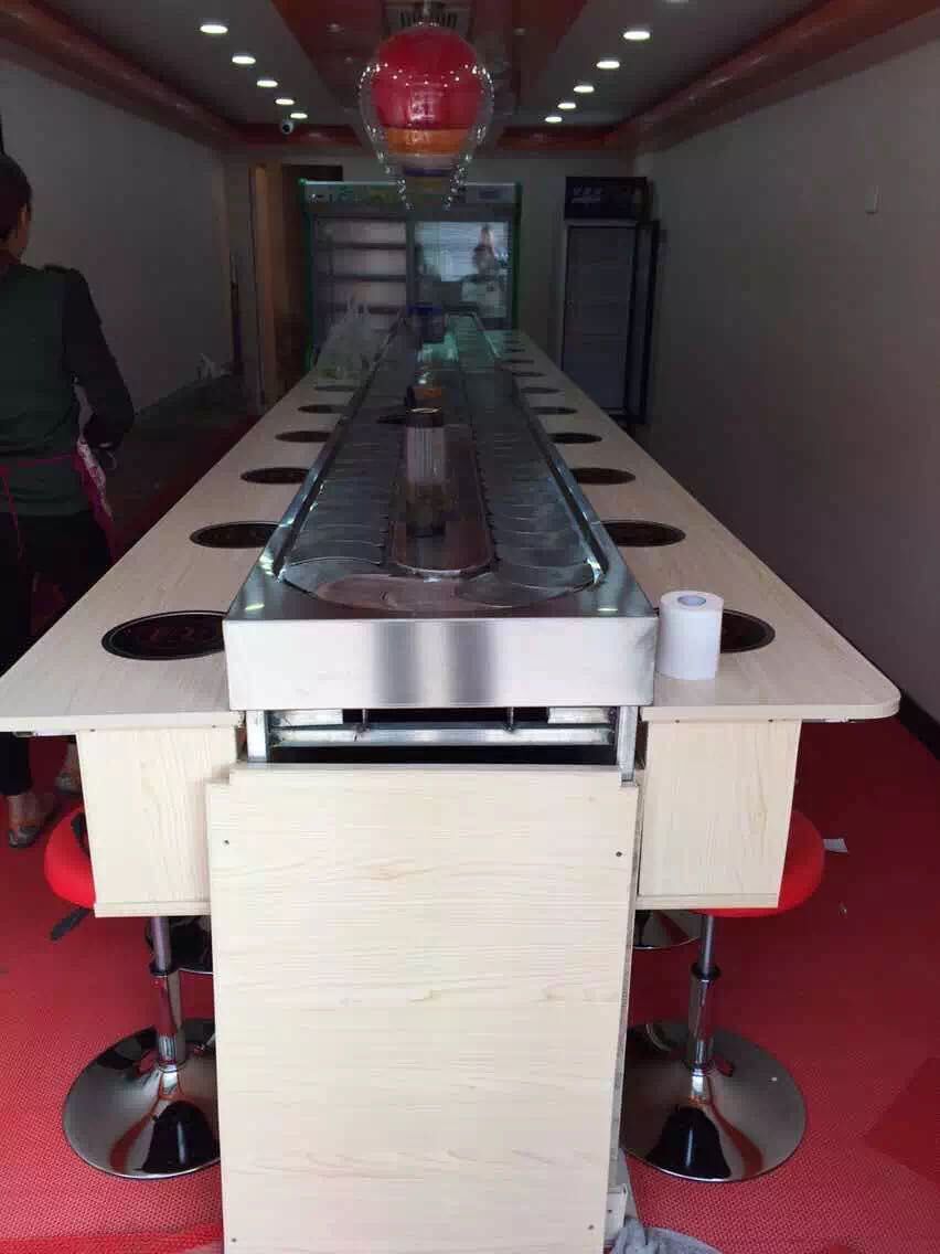 菜品,衛(wèi)生方便時(shí)尚。轉(zhuǎn)轉(zhuǎn)火鍋實(shí)際上就是顧客圍坐在長(zhǎng)條形桌子兩側(cè),食用桌子中間滾動(dòng)轉(zhuǎn)送的蔬