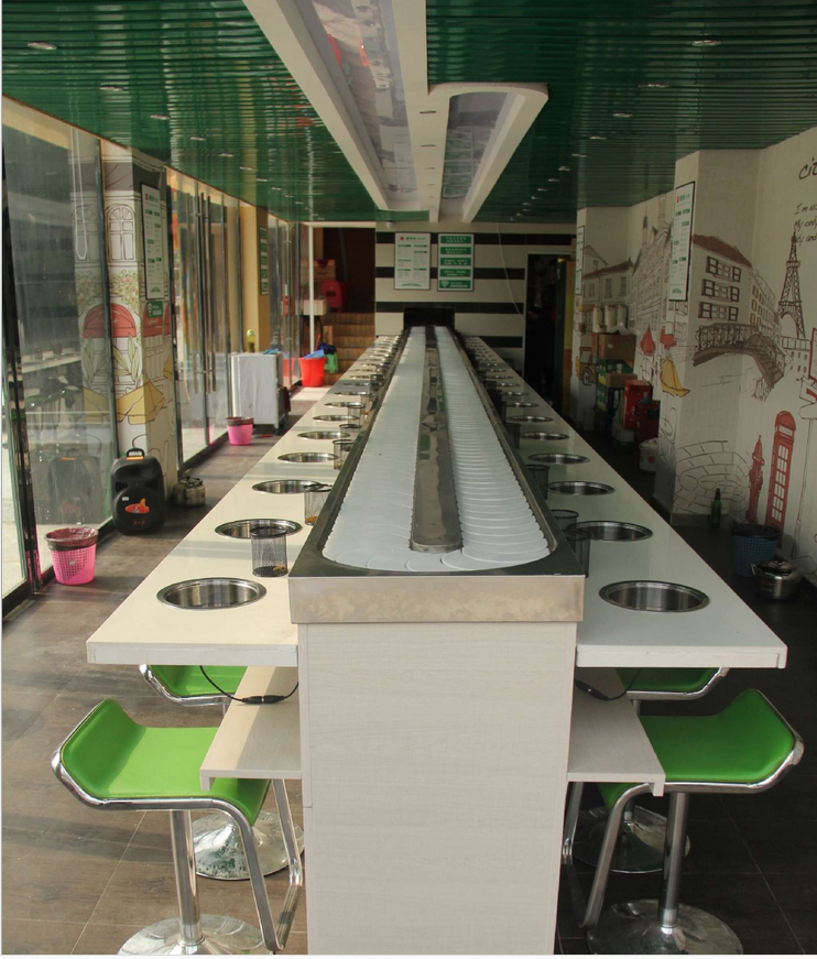就坐在舒適的椅子上看著眼前的食材,喜歡就拿,不喜歡就讓其繼續輸送過去即可。既節約人力資源投入,也方便消費者,更具有安 全、快捷、衛生、舒適、美觀、時尚等特點。 回轉小火鍋設備價格多少,其實這沒有一個具體的數字,完整的回轉小火鍋設備包括臺架裝置、動力裝置、輸送帶、供電系統以及裝飾等等,隨每個客戶的要求不一樣價格也是隨之波動,