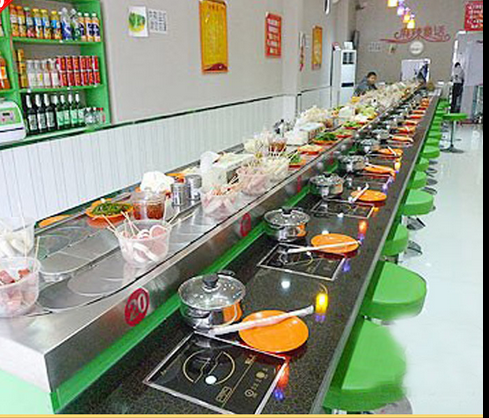 業主可根據自身情況可進行裝修,客人用餐臺面可用大理石或實木裝修,設備還可根據業主餐廳布置的要求,來做不同形狀,其價格合理,外觀精美,無噪音等特點。旋轉小火鍋設備