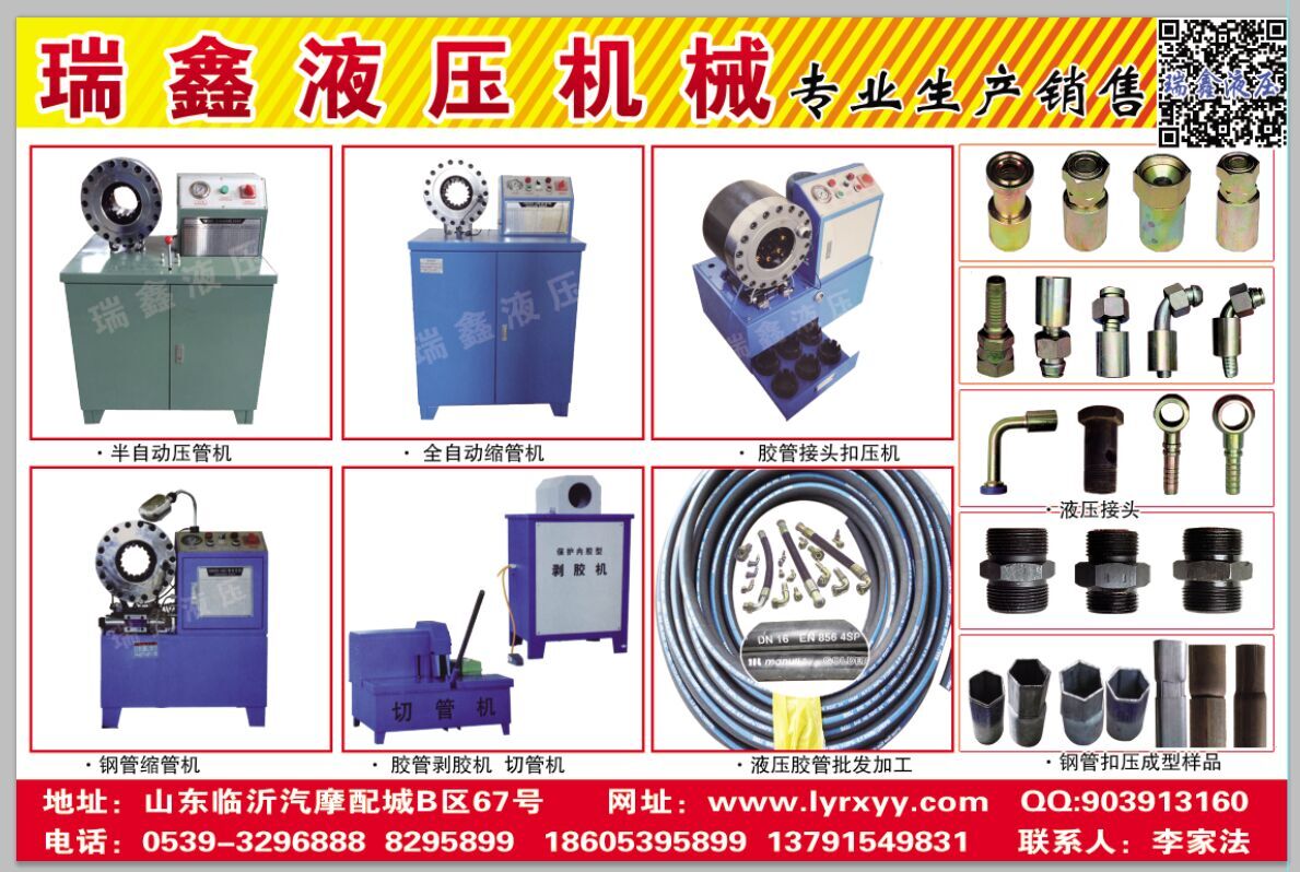 山東瑞鑫液壓公司專業(yè)生產(chǎn)鎖管機(jī)、縮管機(jī)、擠管機(jī)、扣管機(jī)、壓管機(jī)、油管機(jī)、鉚管機(jī)、高壓膠管接頭扣壓機(jī)、膠管剝膠機(jī)、試壓(泵)機(jī)、各種液壓接頭:公制a b c d h f q k型接頭,英美制(鎖母)接頭;對絲,變絲;加工定做各種液壓油缸,高壓油管總成,液壓站,大小口徑的高(低壓)鎖管機(jī),液壓拉床;批發(fā)各種管:高低檔液壓膠管及總成(1-3層編織、2.4層纏繞管)耐油管(耐機(jī)油、液壓油、柴油、汽油管),高壓風(fēng)管、尼龍管、樹脂管、蒸汽管、金屬軟管、氧氣管、加油機(jī)管、食品專業(yè)管、水管;供應(yīng)液壓元件:密封件、齒輪泵、葉片泵、柱塞泵、電磁換向閥、手動(dòng)閥、溢流閥、油管。 鎖管機(jī)是我們的主導(dǎo)產(chǎn)品,具有結(jié)構(gòu)緊湊,操作簡單,油路設(shè)計(jì)先進(jìn),采用新型模具設(shè)計(jì),更換快,效率高,性能可靠,扣壓速度快等特點(diǎn),是集國內(nèi)外同類產(chǎn)品之優(yōu)點(diǎn)綜合設(shè)計(jì)制造的膠管總成生產(chǎn)加工專用設(shè)備,一年保修,指導(dǎo)操作應(yīng)用,提供技術(shù),配件,信息等方面的支持與服務(wù).