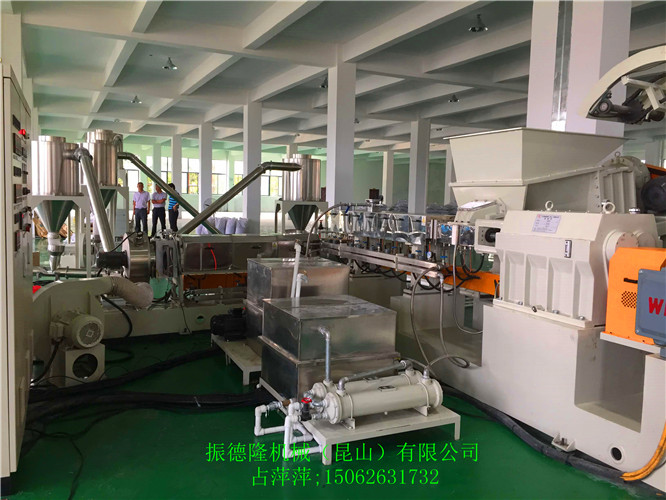 低煙無鹵電纜料造粒機(jī)是將雙螺桿高速,強(qiáng)混煉與單螺桿低速,低溫,弱剪切特性相結(jié)合,揚(yáng)長避短,工藝自動化程度高,流水線作業(yè),分散效果優(yōu)異,產(chǎn)量高,工況清潔,是當(dāng)今熱敏性,剪敏性物料高效配混改性的首選機(jī)型。低煙無鹵電纜料造粒機(jī)獨(dú)特的帶滑軌的對吹式模面熱切機(jī)頭,機(jī)頭部分通水冷卻,單螺桿芯部通水冷卻,有效防止了在生產(chǎn)過程中粘粒現(xiàn)象,產(chǎn)量顯著提高。