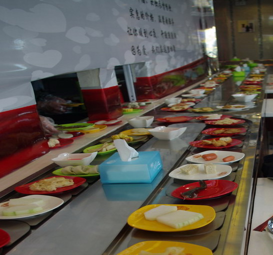 食客在各自的座位上可隨意選擇擺放在輸送帶上的食品,無需服務員送上,本機以臺架代替餐桌,可節省大量餐桌及臺布。3、餐點再旋轉中運用明亮的燈光及輸送帶的移動讓餐點變的更可口,