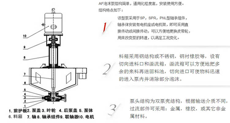 1,af泡沫泵的料箱采用鋼結構或不銹鋼,鋼襯橡膠等,設有切向進料口和溢流箱,溢流箱可以方便地把多余的來料再送回料池,切向進口可使物料迅速地進入泵內并消除部分泡沫。