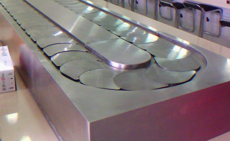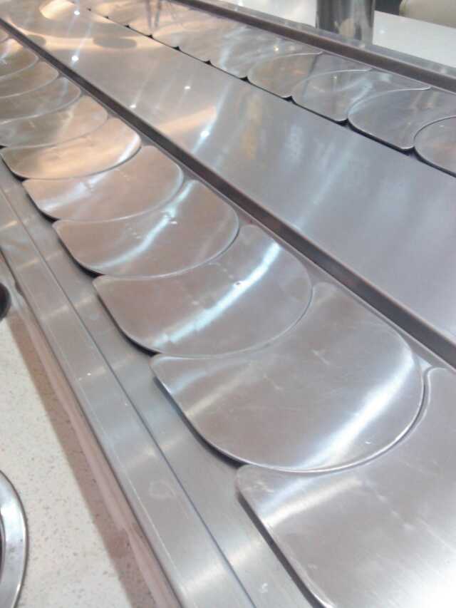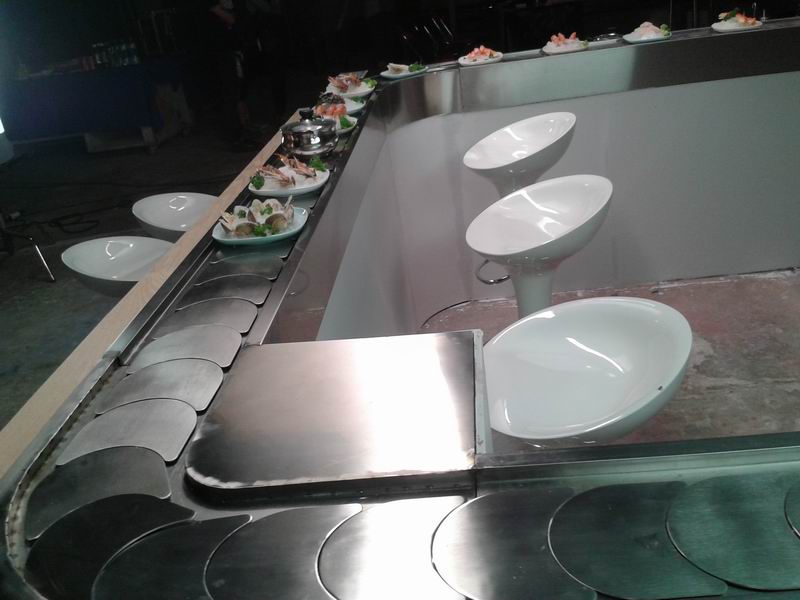 回轉火鍋設備鏈板及鏈條均采用304磨沙面沖壓而成,板厚1.8mm,寬度140mm,鏈條節距100mm,鏈條下部分導軌面板采用304銹鋼鏡面,板厚度為1.2mm,內部采用白色防摩尼龍墊條,旋轉吧臺,壽司料理,旋轉火鍋,自助火鍋餐廳。下架采用30mm*30mm*1.5的碳鋼方管焊接而成,表面經過防銹處理,所有連接部分均采用標準件連接,便于移裝。旋轉吧臺,壽司輸送設備,回轉火鍋輸送帶,適應了飲食界推陳出新,適應了現代人對飲食新奇的追求。旋轉吧臺,壽司輸送設備,回轉火鍋輸送線是你從事餐飲火鍋行業,日本料理,韓國料理必備前衛機械設備.旋轉火鍋 火鍋設備 回轉火鍋設備是從事餐飲創業者的理想選擇。火鍋設備優勢:無明火:采用現代高科技環保制作用具,沒有明火,不存在安 全隱患。