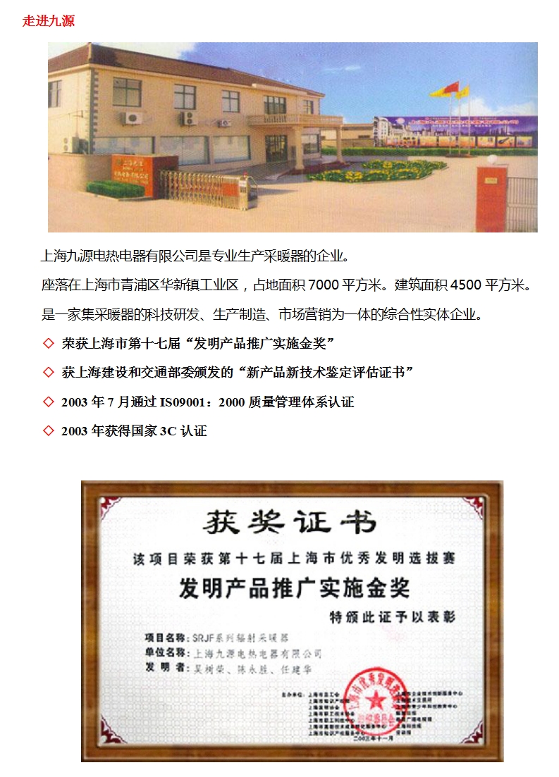 上海九源電熱電器有限公司是專業生產采暖器的企業。座落在上海市青浦區華新鎮工業區,占地面積7000平方米,建筑面積4500平方米。是一家集采暖器的科技研發、生產制造、市場營銷為一體的綜合性實體企業。上海九源電熱電器有限公司成立多年已形成符合現代化企業管理要求的管理體制,建立了質量管理體系。上海九源電熱電器有限公司產品在電輻射供暖行業中始終處于領先地位。并榮獲上海市第十七屆“發明產品推廣實施金獎”,相...