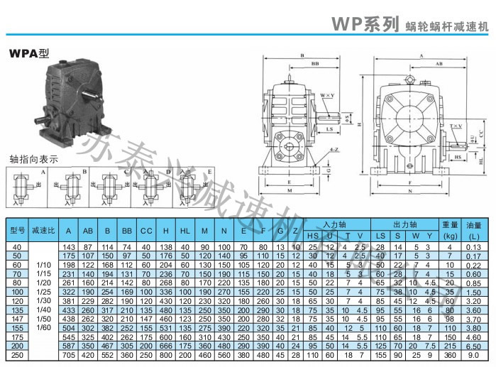 三、庫存現(xiàn)貨及安 裝尺寸:wpa40、wpa50、wpa60、wpa70、wpa80、wpa100、wpa120、wpa135、wpa155、wpa175、wpa200、wpa250、型蝸輪蝸桿減速器主要尺寸。