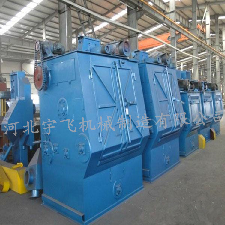 不同規格的產品被倒入清理室內,大門關閉,拋丸器工作,將彈丸(鑄鋼丸或鋼絲切丸)加速拋射至工件表面,對工件表面進行沖擊,刮削以清除產品表面的鐵銹、氧化皮和污物;清理過程中產生的粉 塵由除塵器除去,拋丸結束后,啟動履帶反轉,將工件自動倒進產品小車中,從而使工件達到除銹、去氧化皮的目的。