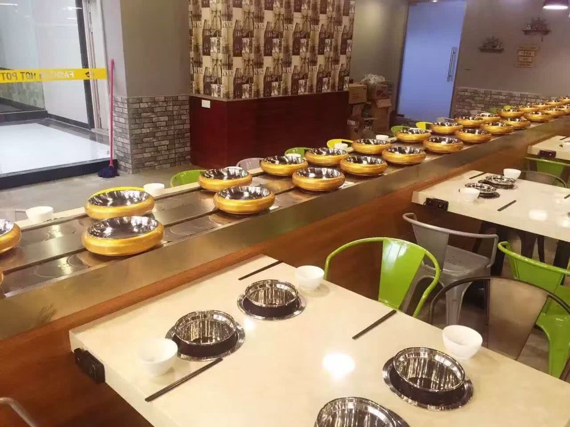 水滴到鏈板上也不怕,只需用抹布一擦,便一干二凈,方便衛生,是火鍋店必備產品。回轉火鍋線的創新點:機械代替人力,把人解放出來,可以做更多的服務。