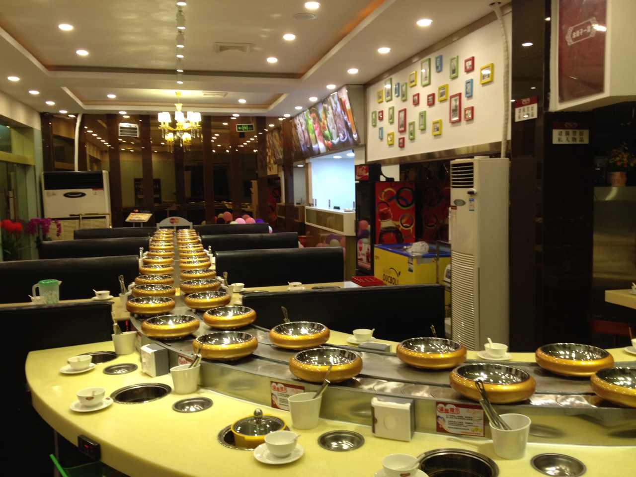 客人只需要坐在自己的位子上,一鍋湯底,菜品自動傳到我們的身邊,只需動動手,就可以拿到自己想要的菜品,來回傳送的精美菜品,更是讓人目不暇接,擁有傳送帶的火鍋店面,更加美觀。
