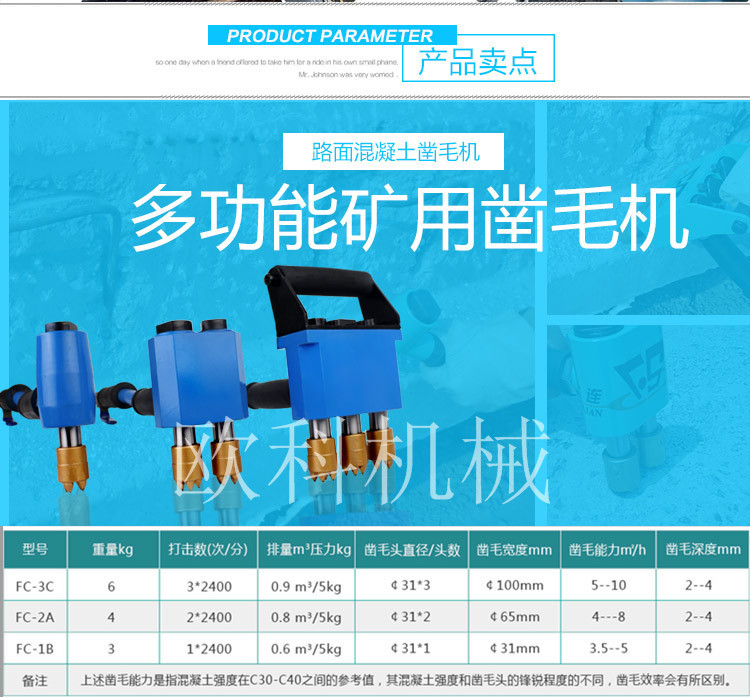 三頭氣動鑿毛機機型小 操作靈敏 其鑿毛機鑿毛頭是高優質鎢鋼合金頭制造 運用壽命長 有超強的作業能力。手持式混凝土鑿毛錘每分鐘每個鑿毛頭可做2400次的鑿擊頻率每小時鑿毛面積按混凝土的強度可到達3-10平方米。