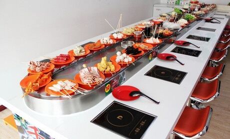 壽司設備,壽司輸送帶,自助旋轉火鍋線是餐飲創業首選設備。回轉火鍋優點有:不需要設大廚房,整個配制、加工過程,都由顧客在餐桌上自己完成,節省空間是其一優點;