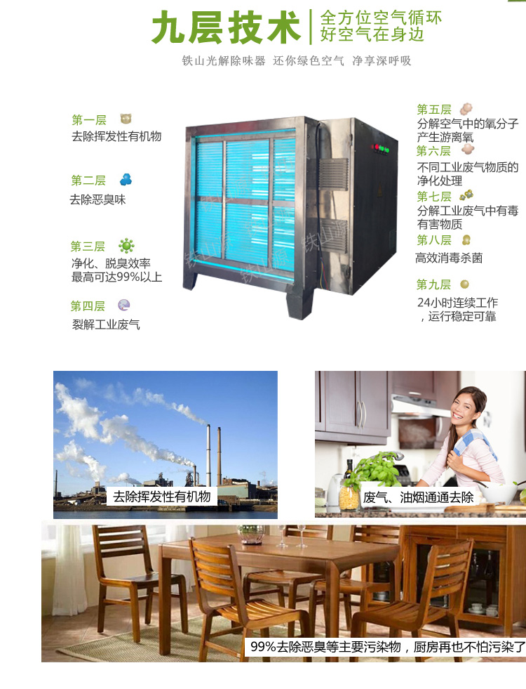 八、環保高科技專利產品:采用國際上最先進技術理念,通過專家及我公司工程技術人員長期反復的試驗,開發研制出的,具有完全自主知識產權的高科技環保凈化產品,可徹底分解工業廢氣中有毒有害物質,并能達到完美的凈化效果,經分解后的氣體,可完全達到無害化排放,絕不產生二次污染,同時達到高效消毒殺菌的作用。