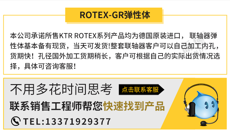 本公司承諾所售ktr rotex系列產品均為德國原裝進口, 聯軸器彈性體基本備有現貨,當天可發貨!整套聯軸器客戶可以自己加工內孔,貨期快!孔徑國外加工貨期稍長,客戶可根據自己的實際出貨情況選擇,具體可咨詢客服!