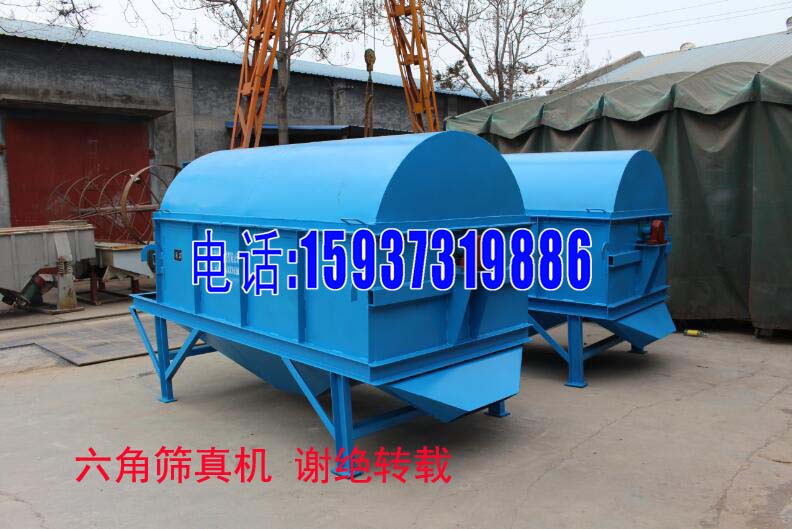高效六角回轉式滾筒篩是一種運動軌跡兼有拋物線運動和滑落運動的新型滾筒篩。一方面部分物料隨著簡體轉動被帶到一定高度作拋物線運動,另一方面其它物料隨筒體轉到一定的高度滑落。由于篩體被設計成六角形,被帶到一定高度的物料在拋落或滑落前的線速度是不同的(理論上)。由于線速度的變化,因此拋落或滑落運動的紊亂度進一步加大,從而有利于篩分效率的提高。物料在做上述運動的同時,由于篩體被設計成傾斜的,物料同時向前運動,因此有較強的向前輸送能力。六角回轉式滾筒篩的篩分效率較圓滾筒篩提高約25%。近年來,六角回轉式滾筒篩在篩分領域逐漸引起人們的重視。