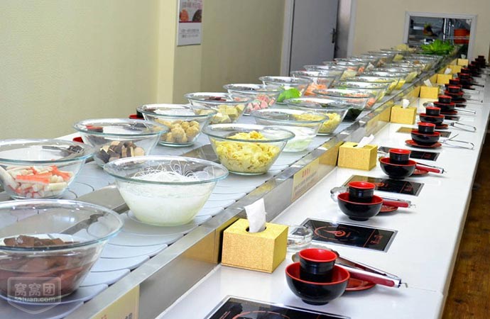 統火鍋店,擁有傳送帶的店面更加吸引年輕人的眼球,而且吃起來方便,客人不需要東跑西跑,來回取菜,客人多的時候服