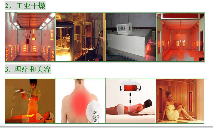 紅外線的電熱量是熱能中最有效的一種。遠紅外線干燥又稱輻射干燥,利用輻射元件 發(fā)射的遠紅外線向濕物料提供熱量的一種干燥方法。工業(yè)上多用遠紅外線干燥物料。幾乎 可用于所有工業(yè)部門,以代替原來的自然干燥、熱風(fēng)干燥、電熱干燥等。 遠紅外發(fā)熱管