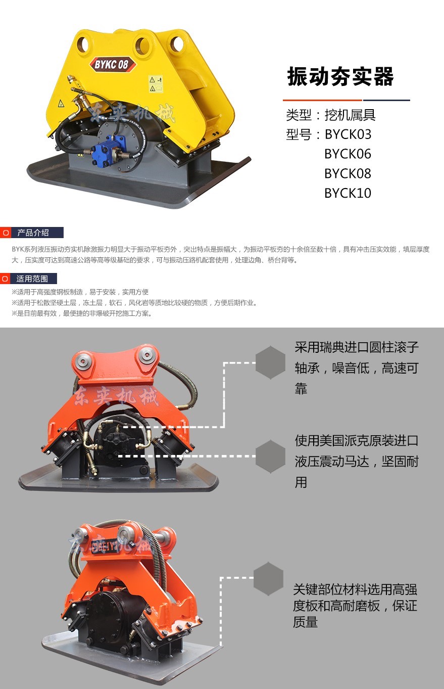 挖掘機振動夯廣泛的應用于斜坡面道路,建筑物基礎工程,堤壩斜面,排水渠泥土石子等的夯壓工作。且具有故障低,保養簡單,安 裝方便,磨損小適合多樣工作等特點,且采用特殊震動板,能有效保護挖掘機的機臂。詳細介紹:跳動幅度大,沖擊力強。該產品設計合理,外形美觀,影響深度大,操作平穩,不留死角,效率高等優點。廣泛用于公路市政建筑,水利等領域在修建路面,街道,樓房,水渠,橋梁時對工程基礎,路緣瀝青路面的夯實。挖掘機振動夯優勢在于適合多地形作業,河提護坡,溝槽凹坑壓實,斜坡邊坡壓實處理,基坑回填土夯實,邊角橋臺背等等壓路機不能工作的地方。與手持電動平板或內燃平板夯相比能大幅度降低勞動強度,減低人工成本,明顯提高效率。因其頻率和振幅大數10倍,且具有沖擊壓實效能,故引響土層深度大,壓實度可與大噸位壓路機相當。對堤壩壓實、渠道壓實、護坡壓實、深溝壓實均能獲滿意的壓實效果。埋管施工后的回填土壓實非常方便,明顯提高工程的效率和施工質量。