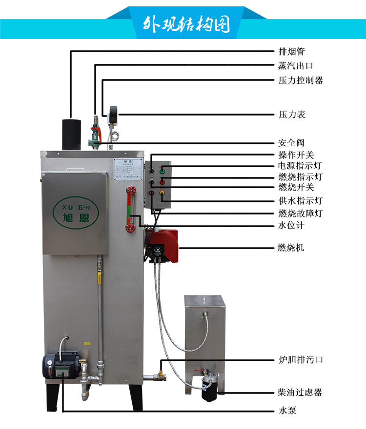 3、進水口和排污口為同一口徑,減少爐膽結(jié)垢,增加使用壽命。