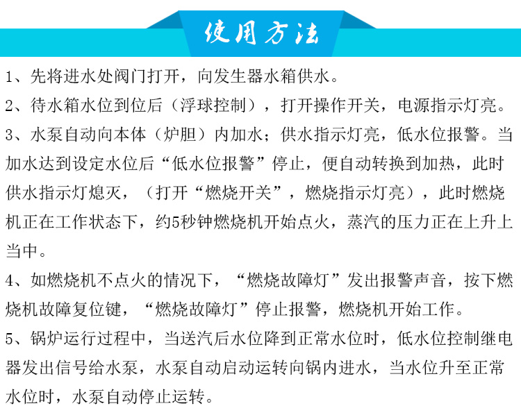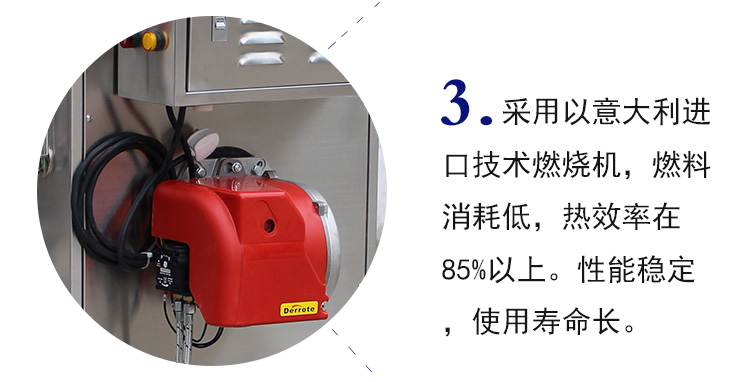 配備了安 全閥、壓力控制器、水位控制保護器等多重連鎖保護裝置,絕對安 全可靠,采用鰭片式水管貫流式爐膽結構,有效地補償熱膨脹,防止熱脹冷縮應力的產生,使鍋爐結構安 全可靠,延長了使用壽命。