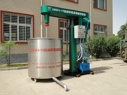 嵩威牌液壓升降分散機(0.5噸、1噸),主要是利用安 裝在攪拌主軸上的鋸齒狀圓盤形分散盤在容器內高速旋轉將物料分散,完成物料的固液分散、濕潤、解聚、穩定等過程。適用于涂料、染料、油墨、顏料、化妝品、樹脂、膠粘劑 、乳液、醫 藥、石油等領域的液體及液—粉 相物料進行高速的攪拌、溶解和分散-嵩威機械
