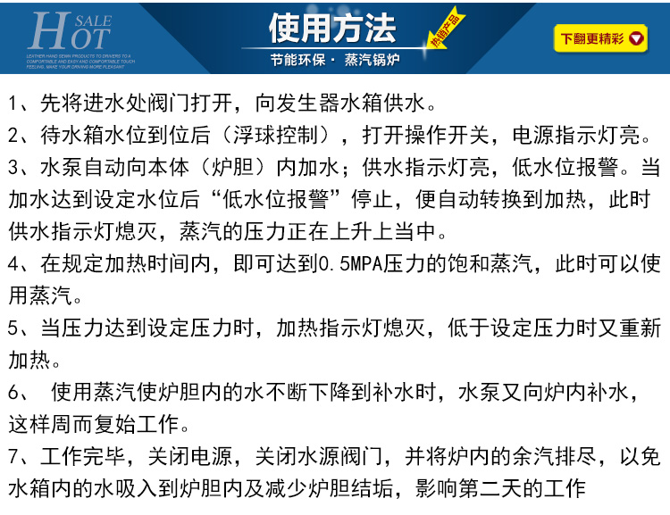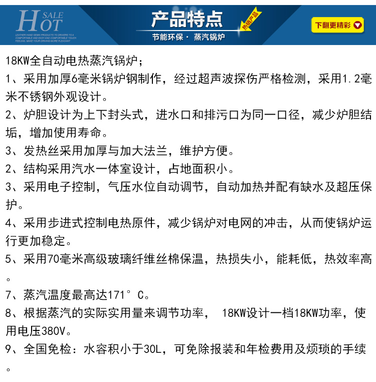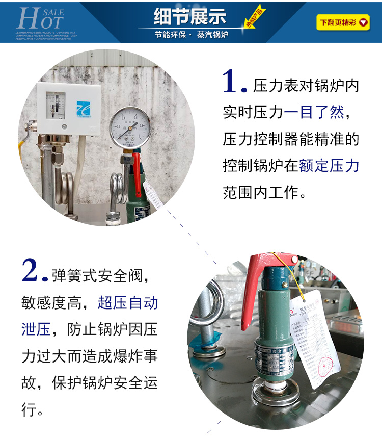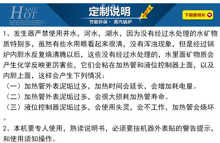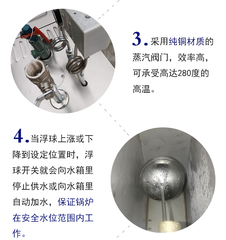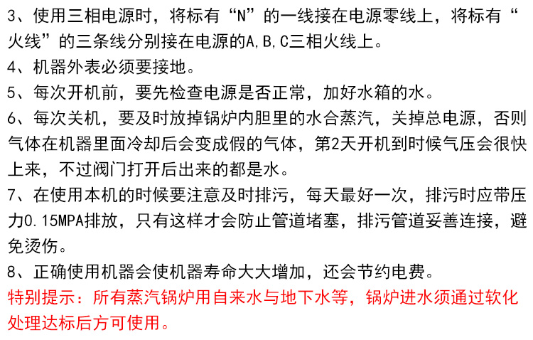 1、安 全性:①漏電保護:當鍋爐發生漏電時,通過漏電斷路器及時切斷電源,確保人身安 全。②缺水保護:當鍋爐缺水時及時切斷加熱管控制電路,防止加熱管發生干燒損壞,同時控制器發出缺水報警指示。③接地保護:當鍋爐外殼帶電時,通過接地線把漏電流導入大地,從而確保人身安 全。通常保護接地線應與大地之間作良好的金屬聯接,常用深埋在地下的角鐵、鋼管做接地體,接地電阻不得大于4ω。④蒸汽超壓保護:當鍋爐蒸汽壓力超過設定的上限壓力時,安 全閥啟動,釋放出蒸汽使壓力降低。⑤過流保護:當鍋爐超負荷(電壓過高)工作時,漏電斷路器自動斷開。