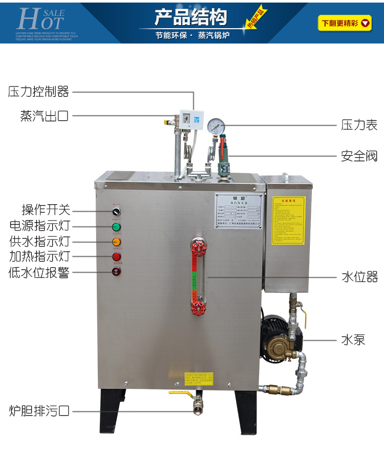 2、方便性:①電源引入電控箱后,一鍵操作,鍋爐便進入(或脫離)全自動運行狀態。②鍋爐內水量減少,控制系統自動通過補水泵把水從水箱補充到鍋爐內。