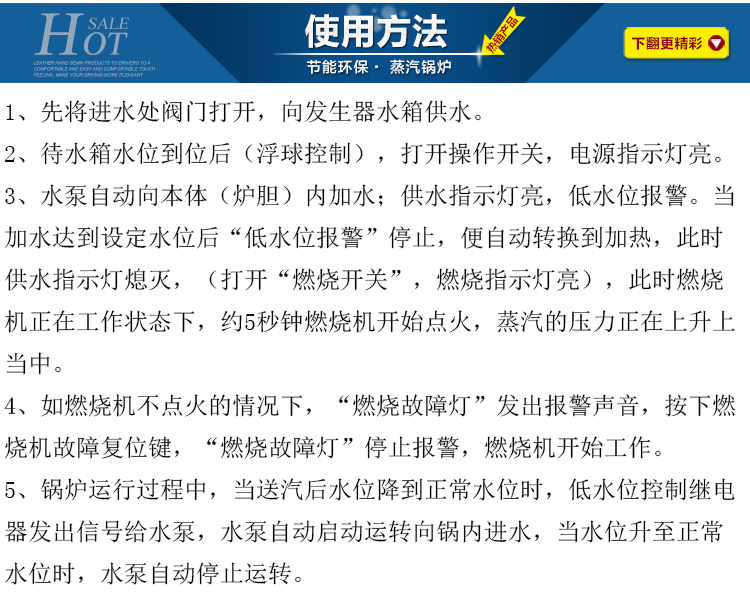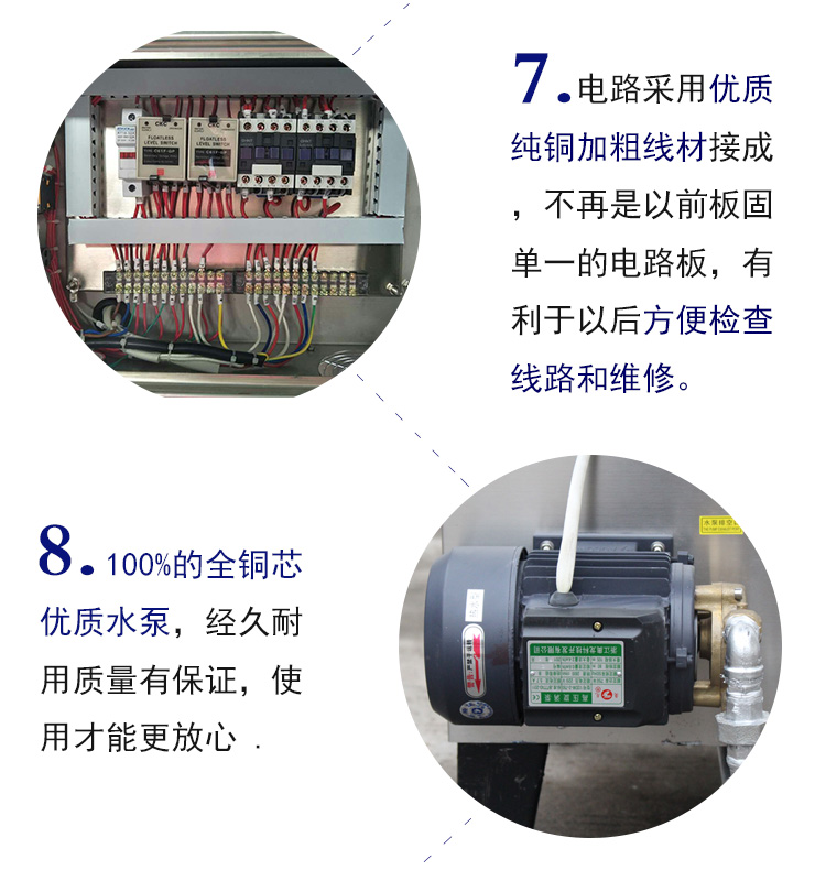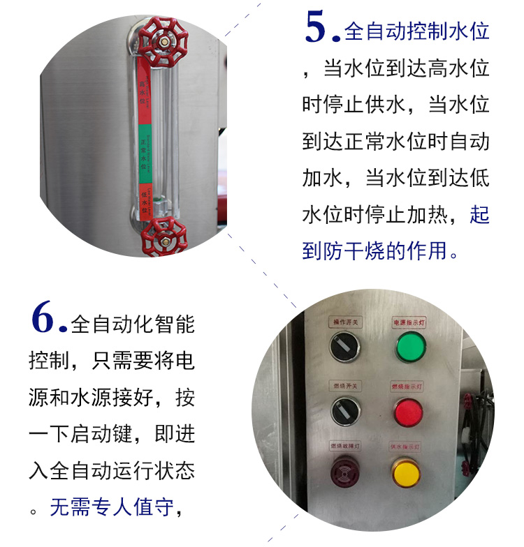 3.不銹鋼蒸汽發生器給水泵采用壓力大、噪聲低的高溫高壓旋渦泵。爐內設有水位控制,加熱加水自動轉換。本系列產品設計獨立電路,易于清洗,易于上水;體積小、熱效率高、安 裝、移動使用方便快捷。