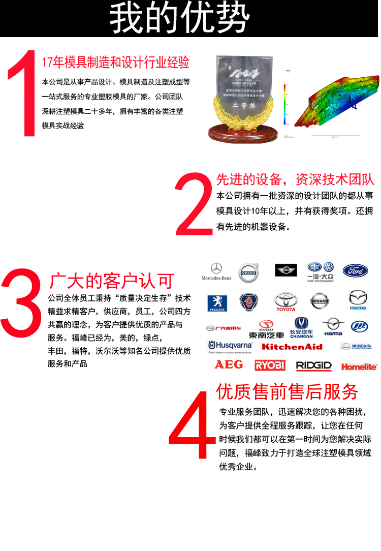 深圳市寶安區松崗福峰模具廠座落于深 圳市 寶安區松崗鎮譚頭第二工業區廠房8棟,是一 家專注塑膠模具行業15年的模具制造出,公 司 具備汽車模具,醫療設備模具,家電模 具,電 動工具模具,雙色模具,包膠模具, 多種模具 設計與產品制造,機加工、CNC加 工、拋光、 電鍍等工藝一條龍的一站式生產廠家,公司不僅傭有精密的模具制造設備和壓鑄設備,還配備了各種...