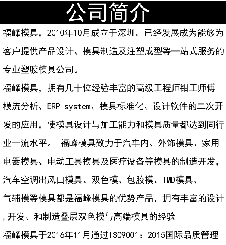 深圳市寶安區(qū)松崗福峰模具廠座落于深 圳市 寶安區(qū)松崗鎮(zhèn)譚頭第二工業(yè)區(qū)廠房8棟,是一 家專注塑膠模具行業(yè)15年的模具制造出,公 司 具備汽車模具,醫(yī)療設(shè)備模具,家電模 具,電 動(dòng)工具模具,雙色模具,包膠模具, 多種模具 設(shè)計(jì)與產(chǎn)品制造,機(jī)加工、CNC加 工、拋光、 電鍍等工藝一條龍的一站式生產(chǎn)廠家,公司不僅傭有精密的模具制造設(shè)備和壓鑄設(shè)備,還配備了各種...
