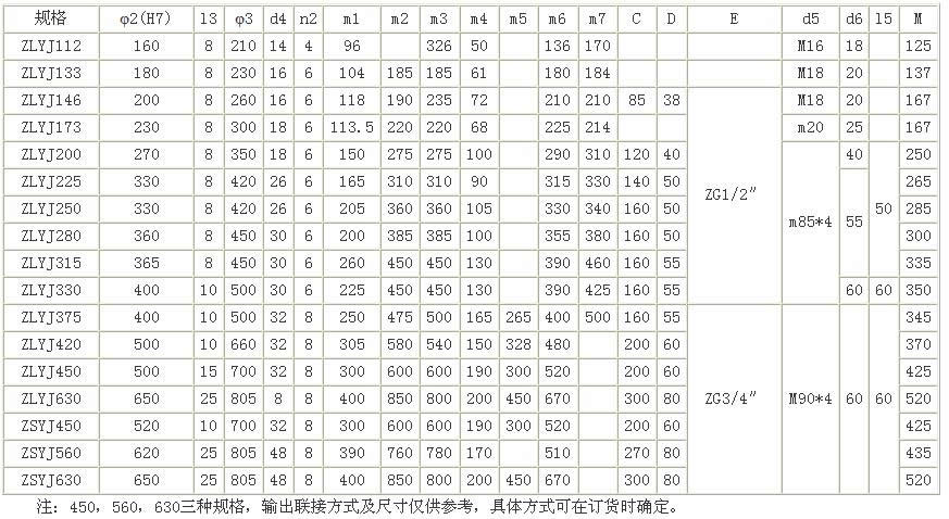 三、規格和理論的適配電機功率:zlyj133 可靠適配功率5.5-11kw 規格zlyj 140 可靠適配功率7.5-13kw 規格zlyj 146 可靠適配功率11-15kw 規格zlyj 173 可靠適配功率15-22kw 規格zlyj 180 可靠適配功率18-30kw 規格zlyj 200 可靠適配功率22-45kw 規格zlyj 225 可靠適配功率30-55kw 規格zlyj 250 可靠適配功率45-75kw 規格zlyj 280 可靠適配功率55-90kw 規格zlyj 315 可靠功率75-130kw 規格zlyj 330 可靠功率110-160kw規格zlyj375 可靠功率130-200kw規格zlyj420 可靠功率200-260kw,以上功率僅供客戶參考,以客戶實際為準。