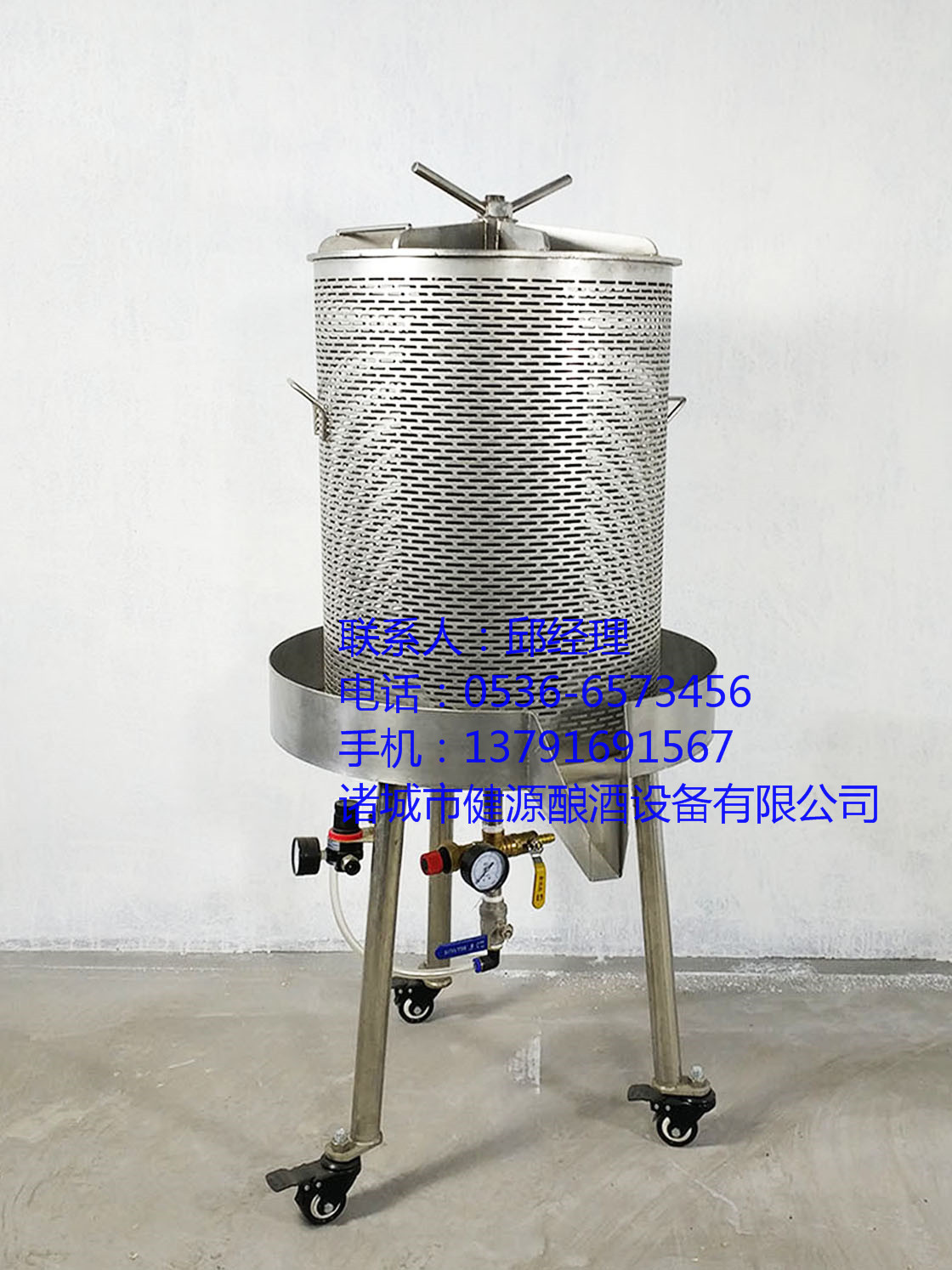 該壓榨機是以柔性食品級橡膠制成的氣囊與不銹鋼罐體構成的壓榨機,經充入壓縮空氣氣囊充氣時向外膨脹,從內向外擠壓含汁果渣,經由濾網及收集汁盤提取果汁的專用設備。具有入料便捷,壓力作用面積大,壓力分布均勻,擠壓柔和,出汁率高等優點。適應各種水果品種發酵后的壓榨,設備上安 裝有壓力表、進氣壓力調節器、放氣閥、進氣閥、壓力安 全閥,操作安 全、方便、快捷。
