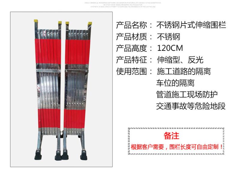 產品概述: 不銹鋼片式伸縮圍欄經過多道特殊工藝制作而成,每道工序都嚴格按照高標準的制作工藝進行制作,使不銹鋼圍欄持久堅固耐用,外觀高檔大氣,能有效提升使用場所的整體環境檔次,是高檔社區、星級酒店、大型商場等高檔次基礎設施配套的最佳產品選擇!