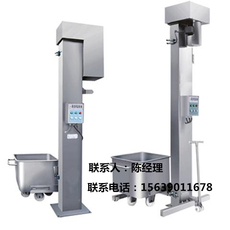 提升機產品介紹: 提升機是一種用于肉制品加工生產線提升肉料的專業設備,取代了人工加料的繁瑣操作,半自動化控制大大降低了人工勞動強度。 提升機分為移動式提升機和固定式提升機兩種機型,t200型提升機是專為200l標準肉車配套的提升設備,其功能是將肉料提升到一定高度后,傾倒至設備的料斗中,以完成加料工作。該機采用全不銹鋼材料制造,鏈條傳動,運行平穩,便于清洗,操作方便,美觀耐用,采用進口雙行程開關控制。
