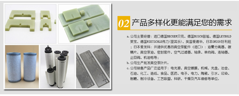公司座落在東莞市石碣鎮,主要經營:進口德國BECKER貝克、德國BUSCH普旭、德國LEYBOLD萊寶、德國RIETSCHLE偉力(里其樂)、英國愛德華,日本ORION好利旺;日本愛發科真空泵:并提供優惠的真空泵配件(進口):油霧分離器、碳精片、真空泵油、密封套件、空氣過濾器、軸承、單向閥、連軸器、止回閥、機油格等;生產批發各類真空泵葉片。