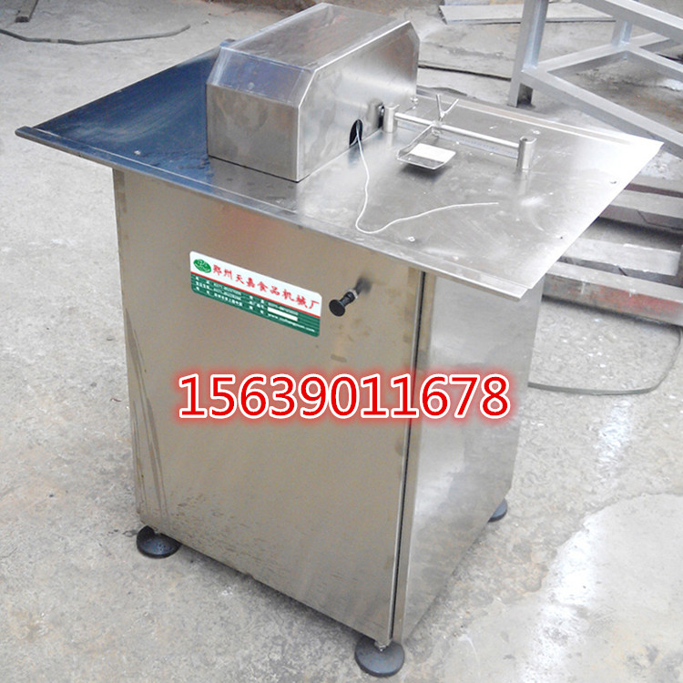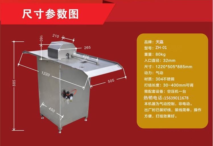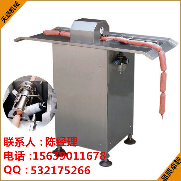 ,開機前將標準氣源接上二聯件上把氣壓調至0.6mpa,再將手拉閥拉出打開氣源,把按板調至所需的長度,然后將灌好的香腸以孔中穿出。節腸體在端部按下按板,然后馬上回到繞線的桃形夾,這時繞線已繞好,用拇指和食指來夾住扎節的端部拉到按板同時按下后,馬上回去重復上述動作。