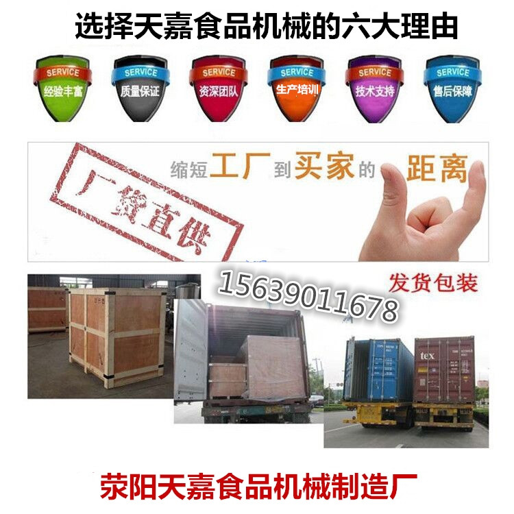 產品承諾:一年三包+終生維修+量身定做+長期跟蹤服務是滎陽天嘉食品機械廠的服務宗旨,并配有多位技術全面的工程技術人員上門服務,為客戶解決技術難題。公司提供全套的安 裝調試,維修,技術咨詢等售前售后一條龍服務。