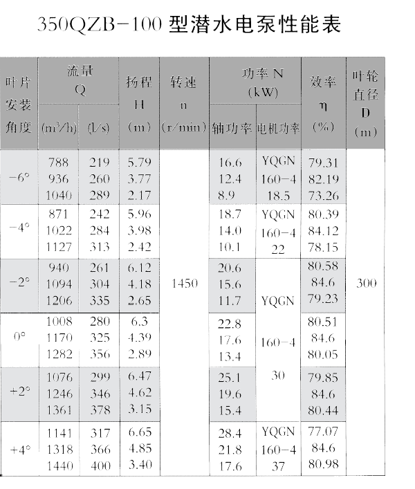 本公司潛水泵名義出水口徑有350、500、600、700、800、900、1000、1200、1400、1600共計十種口徑,流量范圍0.1~12m3/s,揚程范圍2~14m;功率范圍7.5~630kw;電壓等級380v、660v、3kv、6kv、10kv。