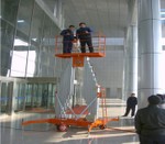 雙桅桿鋁合金升降機系列其價格比吊臂式升降臺要便宜50%,除了價格便宜外,雙人升降臺系列在狹窄通道的靈活性,使其能完成許多吊臂式升降臺不能完成的工作。可單人或雙人操作,寬闊的平臺提供足夠的空間,便于操作人員作業,擺放工具。具有最剛硬的升降桅柱系統,其特征是:高強度的鋁合金桅桿,互鎖系統,可伸縮柱及安 全系數大于10:1的高強度的起重鏈,并設有鋼絲安 全保護系統可用來加強力度及可靠性能,維修方便,其焊接式高強度的鋼底座適合于惡劣的工作環境。雙桅桿鋁合金升降平臺是本公司獨有的產品,由電液傳動,安 全可靠,最高工作高度可達16米,最大載重250kg左右,需要進入普通載客電梯設計的新型產品,具有體積緊湊,安 全堅固,使用方便的特性。種類:分別有sjyl-9ii、10ii、11ii、12ii、13ii、14ii,16ii,最高工作高度為18米。采用高質鋁合金材料制,設計輕巧,堅固安 全,寬闊平臺能負載共兩人及工具工作,更有效及安 全。優點 : 1、最高工作度為18米