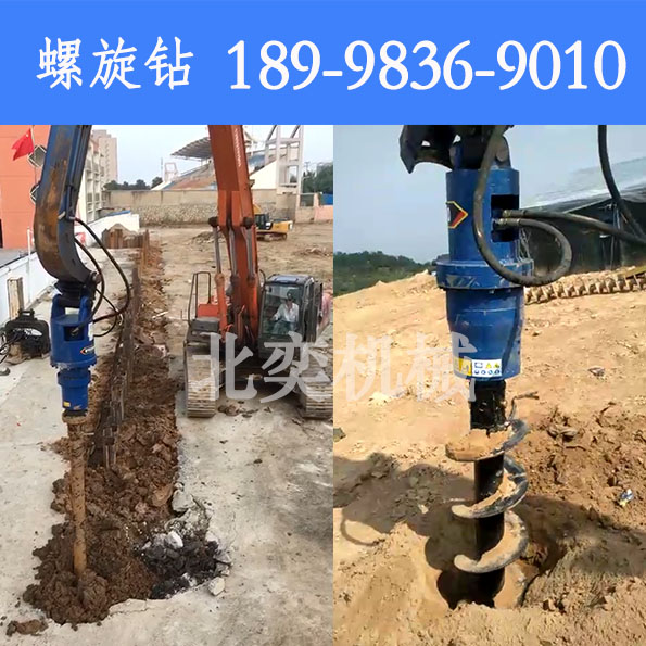 螺旋鉆機-安 裝于挖掘機上使用,用于挖坑、太陽能管樁引孔或打螺旋地樁,主要由驅動頭和鉆頭組件構成,驅動頭與鉆頭組件固定連接,鉆頭組件包括鉆桿、包繞著鉆桿的螺旋葉片、以及設置在鉆桿末端的鉆頭或者螺旋地樁,所述的螺旋葉片的底端設置有鉆齒。結構簡單、穿鑿能力更強、生產運用成本低、靈活性高。,用于電力電信挖坑、凍土挖坑、太陽能樁引孔、打螺旋地樁的。挖機螺旋鉆機(旋挖鉆機)的驅動頭是螺旋鉆機的關鍵部件,該部件由進口液壓馬達、行星齒輪減速機組成。同時通過生產各種規格的托架、鉆桿加長桿,使得挖機鉆機可以與多種規格的挖掘機、裝載機等進行配套使用并且使得鉆孔可以鉆的更深。鉆桿規格,直徑范圍覆蓋10mm-1500mm,大鉆孔深度可達到12米。