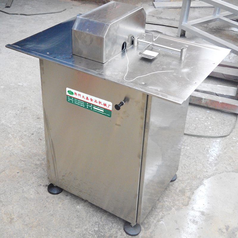 首先,開(kāi)機(jī)前將標(biāo)準(zhǔn)氣源接上二聯(lián)件上把氣壓調(diào)至0.6mpa,再將手拉閥拉出打開(kāi)氣源,把按板調(diào)至所需的長(zhǎng)度,然后將灌好的香腸以孔中穿出。第一節(jié)腸體在端部按下按板,然后馬上回到繞線的桃形夾,這時(shí)繞線已繞好,用拇指和食指來(lái)夾住扎節(jié)的端部拉到按板同時(shí)按下后,馬上回去重復(fù)上述動(dòng)作。