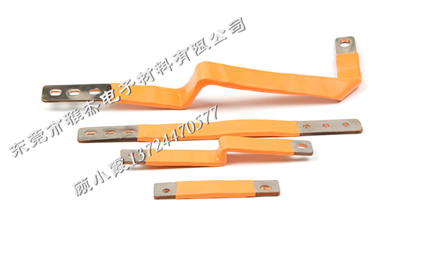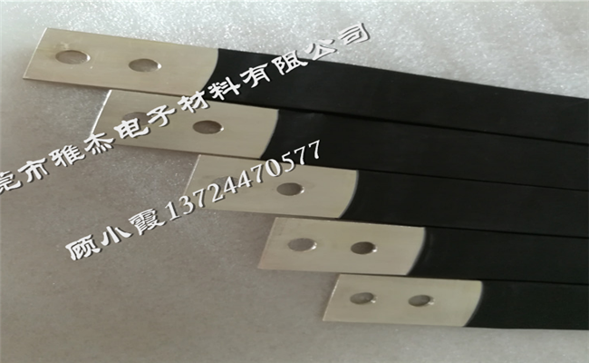 產品工藝:常規使用0.1厚t2紫銅箔,上下表面貼0.1厚純鎳片,或0.1厚鍍鎳銅片。將疊片部分壓在一起,兩端或者打孔部分采用高分子擴散焊,通過大電流加熱壓焊成型。中間套熱縮管保護,大尺寸異形產品,中間采用浸塑工藝。