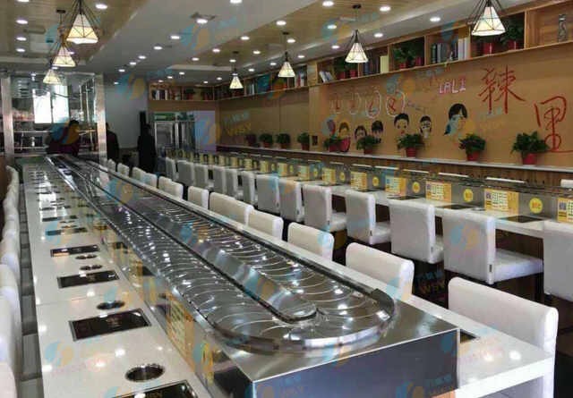 火鍋線,旋轉壽司線,旋轉火鍋線 旋轉火鍋廠家 旋轉火鍋設備主要用于日本料理、韓國料理、西餐廳及自助餐廳等,速度為0-5米/分鐘可調節,鏈板為特制月牙形不銹鋼鏈板,其設備安 裝后,業主可根據自身情況可進行裝修,客人用餐臺面可用大理石或實木裝修,設備還可根據業主餐廳布置的要求,來做不同形狀,其價格合理,外觀精美,無噪音等特點。火鍋線,旋轉壽司線,旋轉火鍋線結構概要: