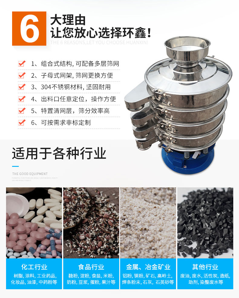 3.不銹鋼振動篩可單層使用,也可多層使用,同時篩分出不同顆粒;