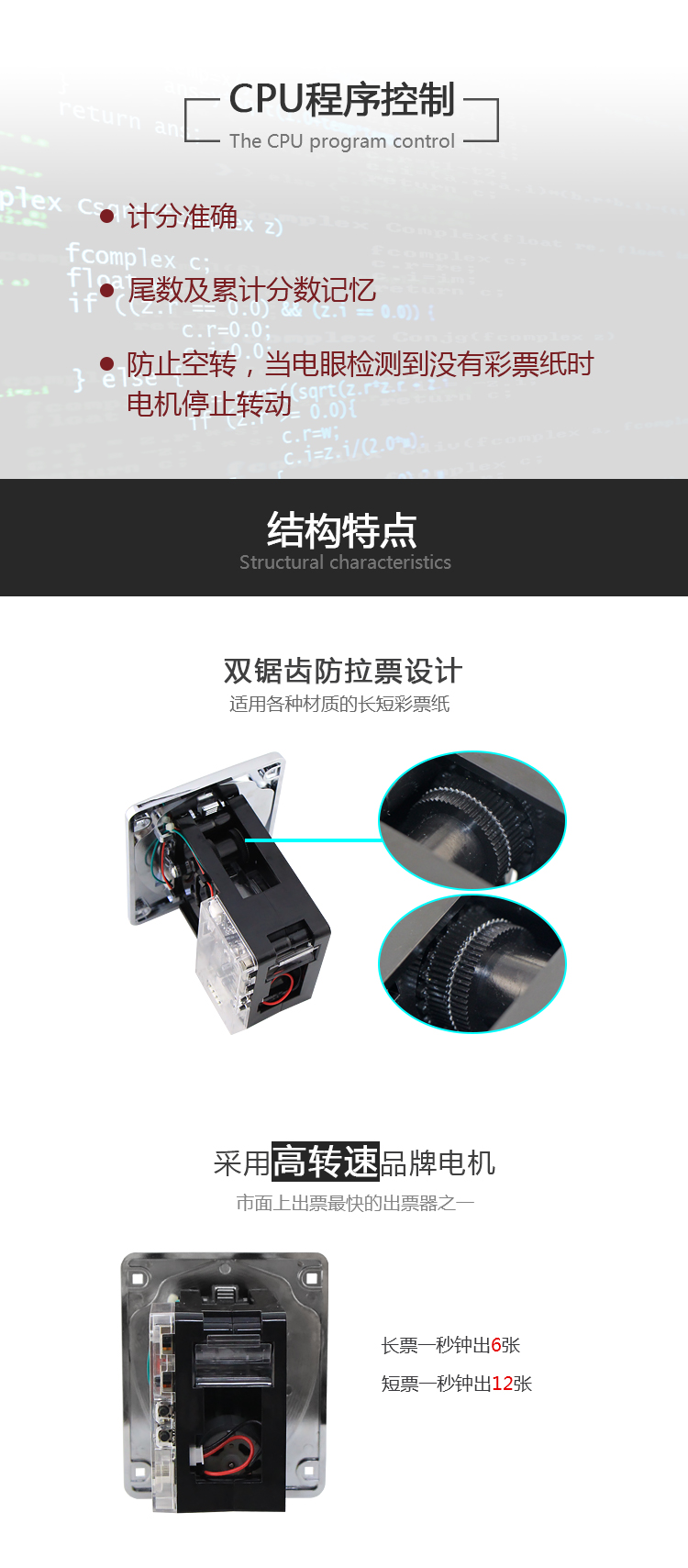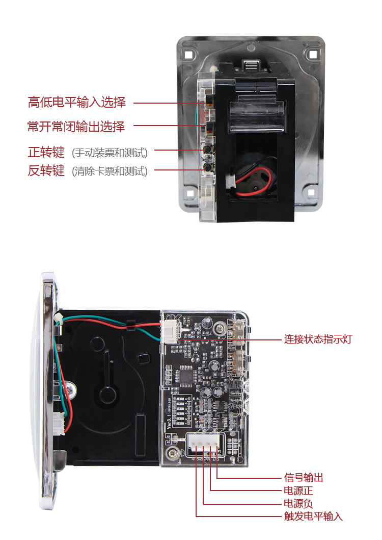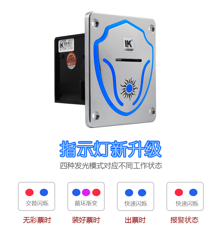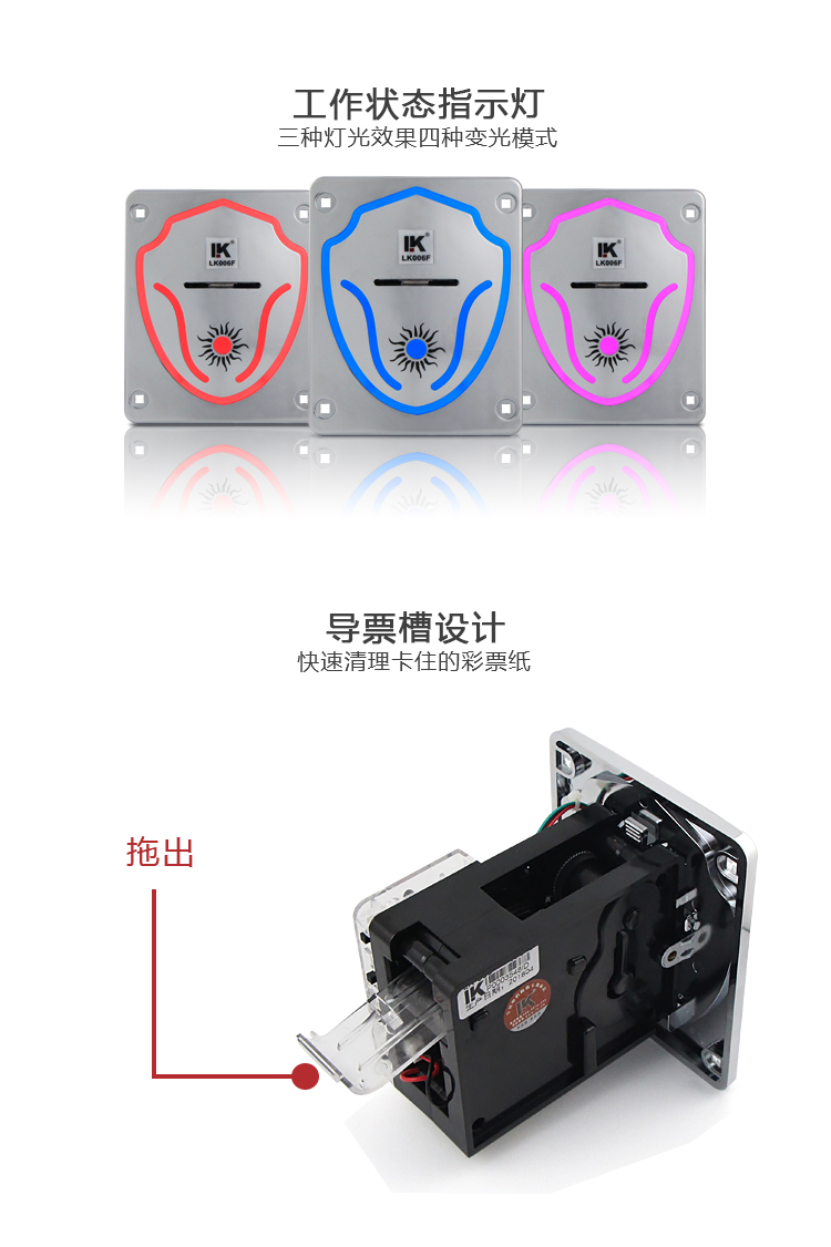 俐康電子行業首發新款彩燈快速出票器lk006f,彩燈閃爍出票情況狀態指示,高級灰新料注塑面板,防刮耐磨效果看得見。全新升級黑色機身,我們肉眼可以看得到的升級部位有:增設了限位平臺,增加骨位,整體強度更大,電眼處增加遮蔽覆蓋搞干擾,以及整體結構重新調整,從結構上改善易拉票、扯出票和彈票情況。另外我們看不到的內部結構:v3.1線路板,全新升級,搞干擾能力更強,指示燈顯示更簡潔清晰