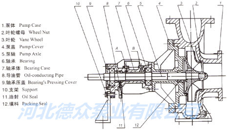 1、該油泵是消化吸收國外油泵的基礎上研制的第二代產品,基本結構形式為單級單吸懸臂式腳支撐結構,熱油泵的進口為軸向吸入,出口為中心垂直向上,和電機同裝于底座上。