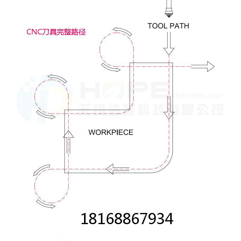 被加工輪廓的內直角拐角處一般難以加工,因為切削刃通常不允許同時切削垂直的兩個面,這樣會導致刀具受力不平衡而產生震動,所以在這種加工條件下,我們建議讓倒角刀的行走路徑在相垂直兩個面的夾角處適當上提,讓切削刃的刀尖部分切削毛刺倒角,且此時應降低轉速,并以圓弧路徑來完成這種復雜條件下的加工。浮動刀柄在去除外直角毛刺時,不能直接沿工件輪廓來拐直角走刀,應如圖所示增加一個虛擬的路徑,以充分完成上一個面或邊的去毛刺倒角,并重新開始新的面或邊的去毛刺倒角。