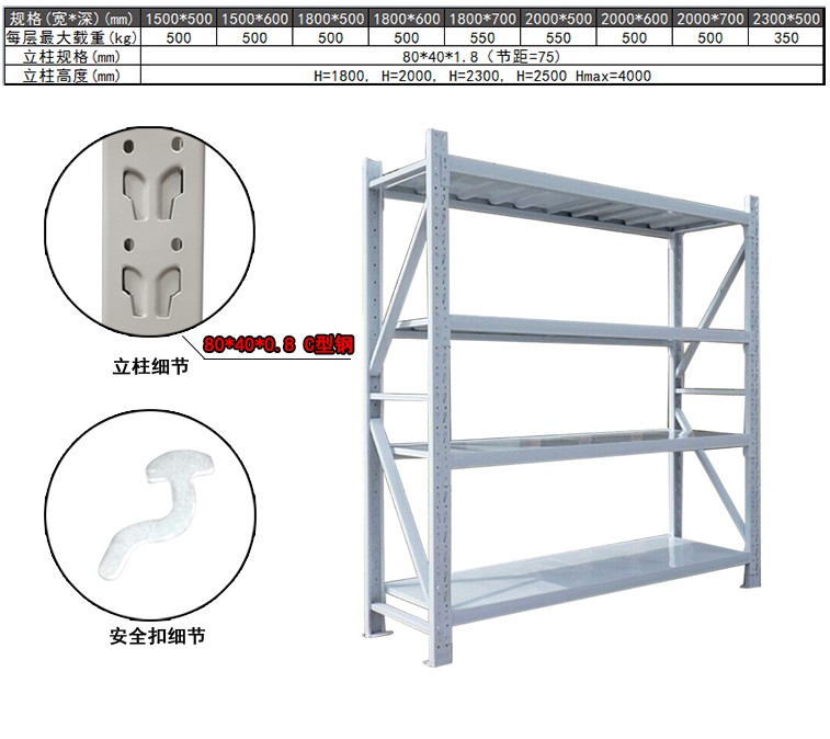 中型貨架特點 1、全組裝式結構,隨意組合,安 裝、拆卸方便靈活。2、立柱為裝配式結構,橫梁與立柱之間采用鋼扣卡插連接,并設以安 全匙鎖定,防止脫落。3、貨架材料截面優化,多種管材選擇,提高承截力。4、貨架立柱是由冷軋鋼板經專用冷彎成型機組滾軋成型,立柱正面沖雙排孔,立柱設有每75mm調節孔距,可根據貨物高低任意調節。5、采用蝴蝶孔更加美觀大方。6、貨架各部件加工好成型之后全部經打磨、酸 洗、磷化、全自動粉 末靜電噴涂、烘干等工藝處理后組裝成品。生產出的貨架成品表面光潔、美觀;貨架層可上下依75mm節距任意調節,拆裝方便。7、相鄰背靠方向立柱之間可采用隔撐加強連接,立柱底部與地面可配合地釘使用,提高安 全及可靠性。