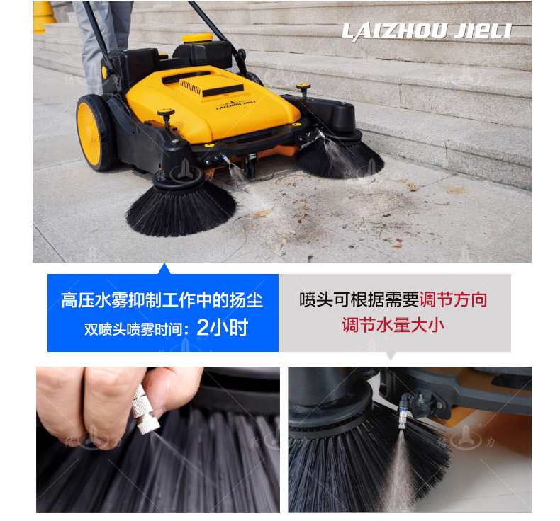 jl920s手推式噴霧式無動力掃地機,是針對清掃粉 塵多、易揚塵等場所而開發設計的新一代掃地機。該機前端的兩個噴頭噴出高壓水霧,高壓水霧與前刷工作時產生的揚塵結合后迅速下墜落地,隨前刷及主刷的工作,與垃圾、粉 塵一起收入垃圾箱內,不但能解決前刷工作時的揚塵問題,而且達到更好的清掃效果。