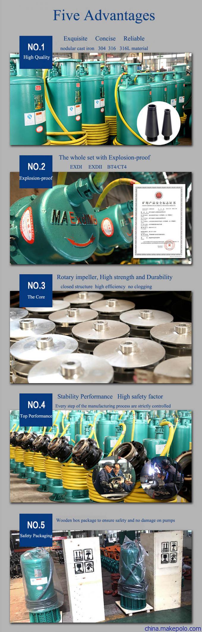 bqs系列礦用隔爆型排污排沙潛水電泵是我公司與江蘇大學(xué)聯(lián)合研制開發(fā)的,產(chǎn)品規(guī)格齊全,功率范圍從2.2kw~315kw,流量范圍從10m3/h至2500m3/h,揚(yáng)程范圍從7m至700m,全部產(chǎn)品皆實(shí)現(xiàn)了全揚(yáng)程、無過載。公司鍥而不舍地對(duì)產(chǎn)品進(jìn)行技術(shù)創(chuàng)新,解決了排污排沙潛水電泵在產(chǎn)品結(jié)構(gòu)、參數(shù)優(yōu)化、制造工藝、運(yùn)行效率、密封防漏、材料應(yīng)用等方面的技術(shù)關(guān)鍵問題,擁有二十多項(xiàng)專利技術(shù),應(yīng)用了多項(xiàng)最新研究成果,形成了成熟的電機(jī)、電泵制造工藝流程,與國(guó)內(nèi)同類產(chǎn)品相比具有安 全可靠、輕便實(shí)用、排污排沙性能好、使用壽命長(zhǎng)、型譜合理、選型方便等優(yōu)點(diǎn)。